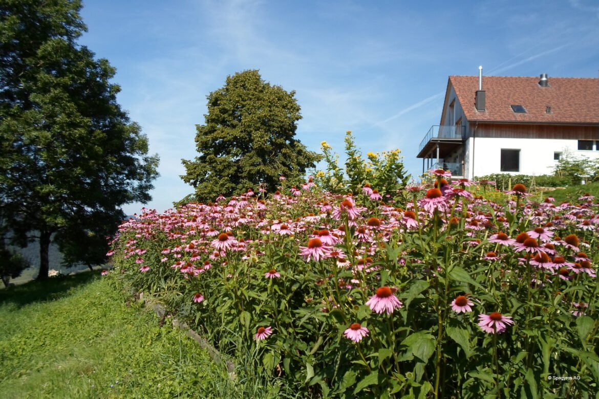 Bei der Herstellung von spaygrischen Essenzen überlässt die Firma Spagyros nichts dem Zufall. Schon der 400 Quadratmeter grosse Garten im jurassischen St.-Brais ist an einem Kraftort auf fast 1000 Metern Höhe angelegt. Hier wachsen rund 200 verschiedene Pflanzenarten. Eine davon ist die Gundelrebe (Glechoma hederacea). Sie hat sich selbst angesiedelt und wächst dort, wo es ihr gefällt. Die kultivierten Pflanzen im Garten werden nach Bio- und Demeter-Richtlinien gepflegt und deshalb weder künstlich gedüngt noch gespritzt. Die weiteren rund 150 Pflanzenarten, welche Spagyros für ihre spagyrischen Essenzen verwendet, stammen grösstenteils aus Wildsammlung.